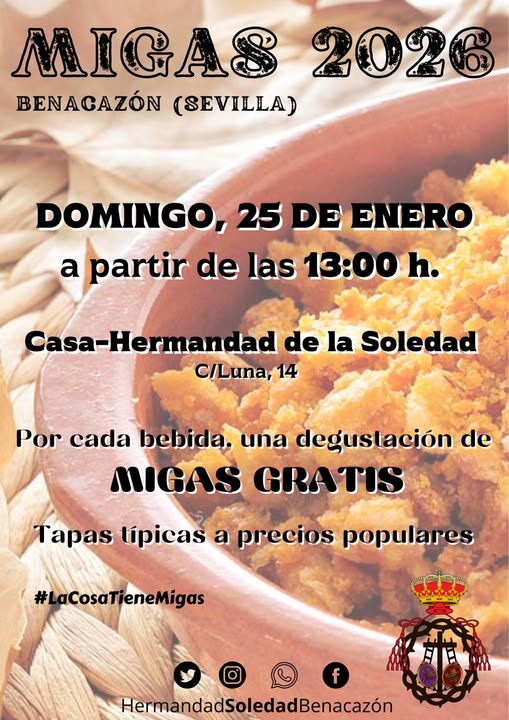 El Ayuntamiento de Benacazรณn comparte el tradicional evento MIGAS DE LA SOLEDAD, que celebra su dรฉcimo primera ediciรณn, y que congrega cada aรฑo a cientos de personas para degustar las deliciosas migas.