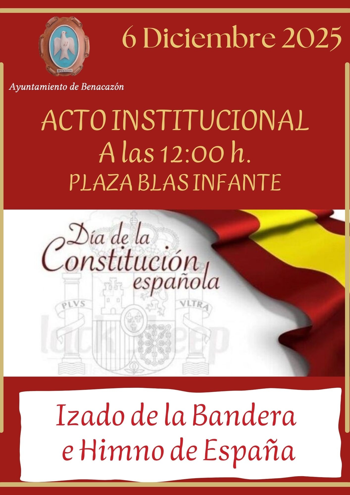 El Ayuntamiento de Benacazón celebrará el acto institucional por la conmemoración del Día de la Constitución Española que tendrá lugar hoy Sábado 6 de Diciembre a las 12:00 h. en la Plaza Blas Infante.