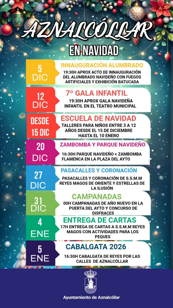 El Ayuntamiento de Aznalcóllar presenta su programación especial para estas fiestas, un calendario lleno de ilusión, tradiciones y actividades para todas las edades.