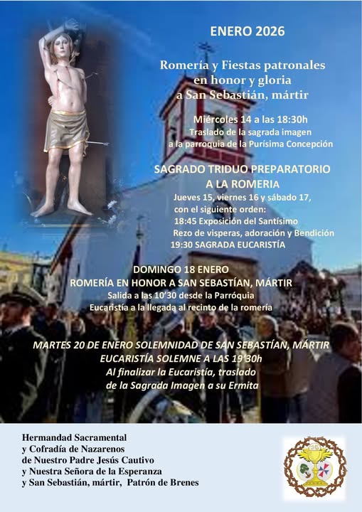 Este domingo 18 de enero, Brenes se viste de fiesta para rendir homenaje a su patrón, San Sebastián Mártir, con una romería que conjuga fervor religioso, identidad local y convivencia vecinal. Organizada por la Hermandad Sacramental y Cofradía de Nazarenos de Nuestro Padre Jesús Cautivo, Nuestra Señora de la Esperanza y San Sebastián Mártir, la jornada comienza a las 10:00 horas con el traslado de la imagen del santo desde la parroquia hasta su carreta, dando inicio a un recorrido que atraviesa buena parte del municipio hasta llegar a la explanada situada detrás de la piscina municipal.
