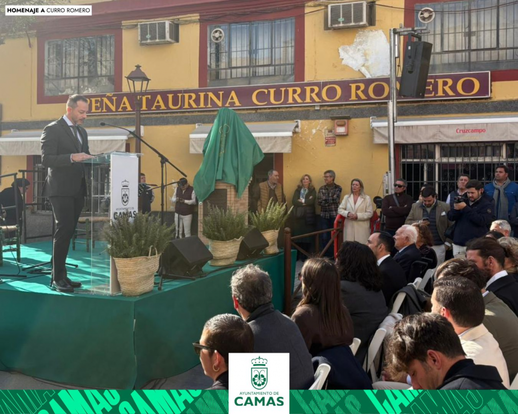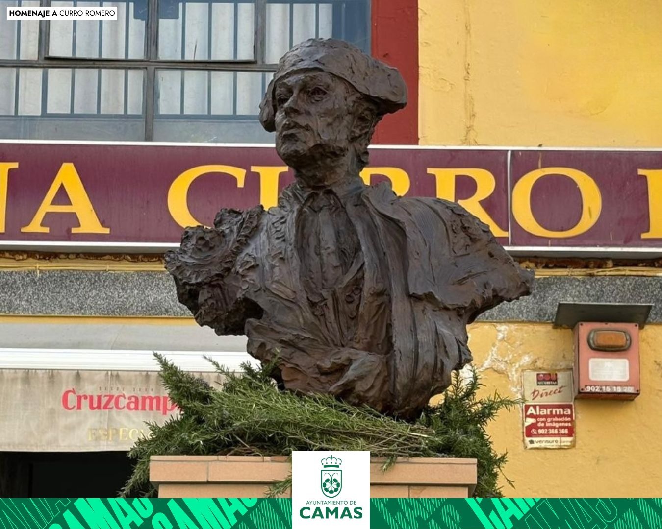 La calle Santa María de Gracia de Camas, justo frente a la peña taurina ‘Curro Romero’, luce ya el busto homenaje a una de las grandes figuras históricas de toreo.