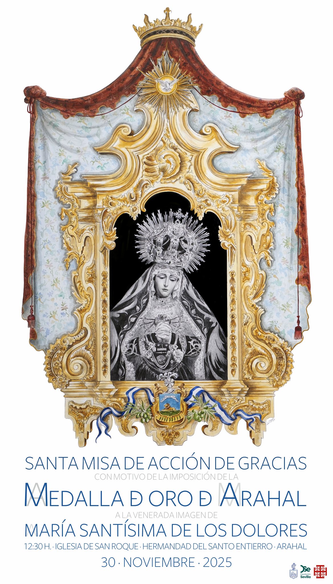La Hermandad del Santo Entierro de Arahal ha presentado el cartel conmemorativo de la Santa Misa de Acción de Gracias que se celebrará el próximo domingo, 30 de noviembre, a las 12:30 h en la Iglesia de San Roque, con motivo de la entrega de la Medalla de Oro de Arahal a esta Hermandad por parte del Excmo. Ayuntamiento y de la solemne imposición de esta distinción a la sagrada imagen de María Santísima de los Dolores.