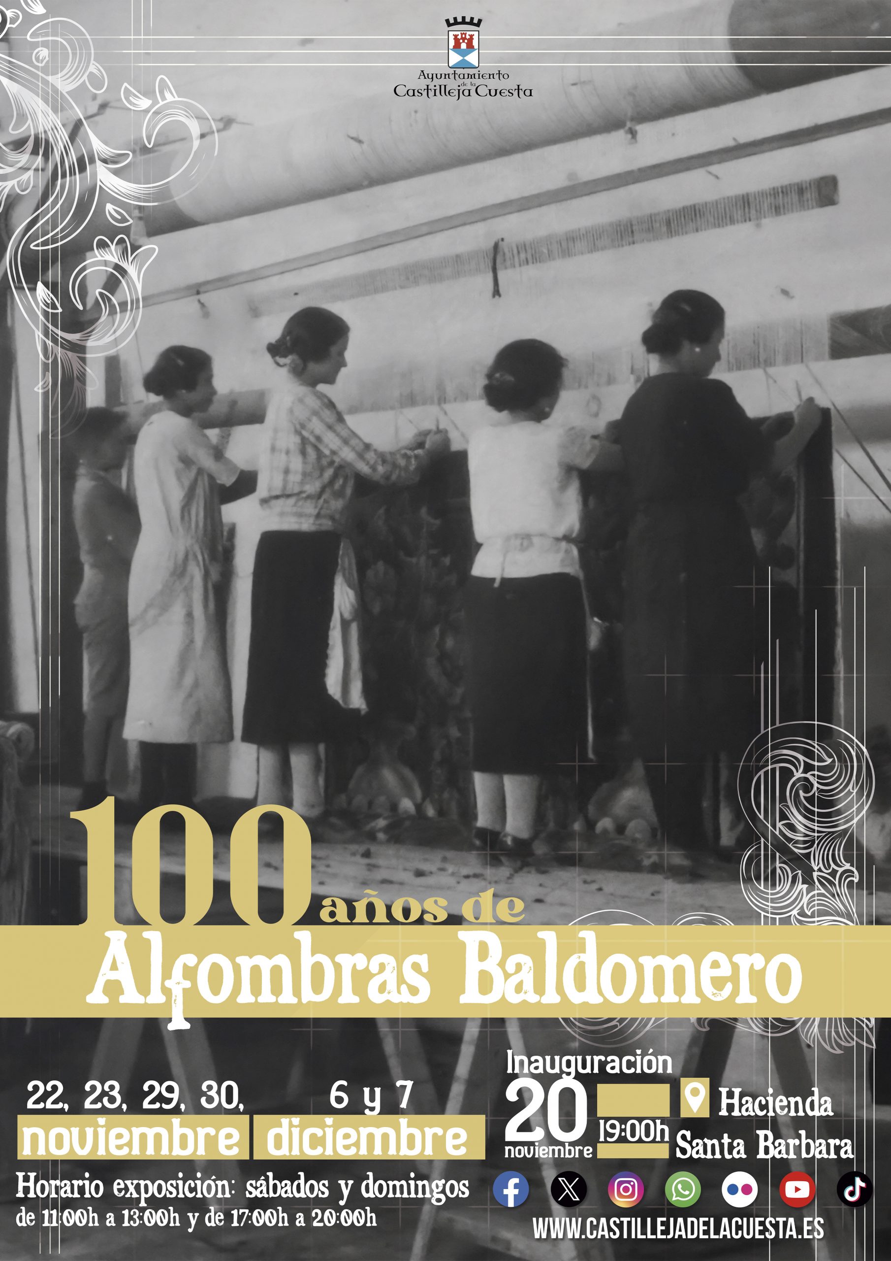 El Ayuntamiento de Castilleja de la Cuesta celebra el siglo de vida (1925-2025) de Alfombras Baldomero con la inauguración de una exposición que recorre sus 100 años de vida. La alcaldesa, Carmen Herrera, inaugura hoy esta muestra a las 19.00 horas en la Hacienda Santa Bárbara, acompañada de miembros de la familia de tres de las cuatro generaciones que hoy lideran esta empresa local.