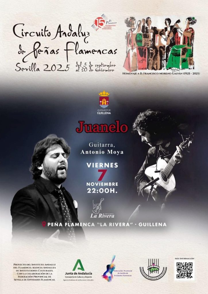 El programa de actividades comienza este próximo viernes 7 de noviembre, a las 22:00 horas, en la Peña Flamenca La Rivera, con la actuación de Juan Juanelo, acompañado de la guitarra de Antonio Moya. Esta actividad forma parte del Circuito Andaluz de Peñas Flamencas que rinde homenaje en 2025 a Francisco Moreno Galván en el centenario de su nacimiento.