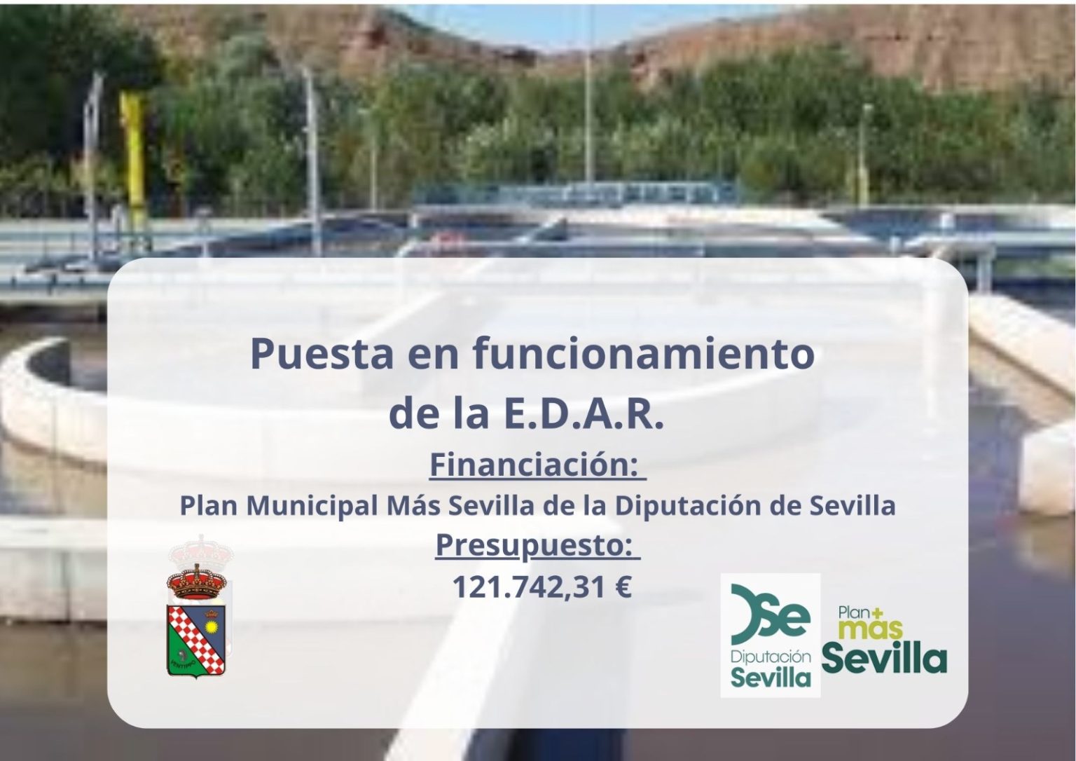 Esta intervención está financiada por la Diputación de Sevilla, en el marco del Plan MÁS SEVILLA, dentro de la Línea Estratégica de Inversión Medioambiental, correspondiendo a la Actuación 5, denominada “Puesta en funcionamiento de la EDAR”.