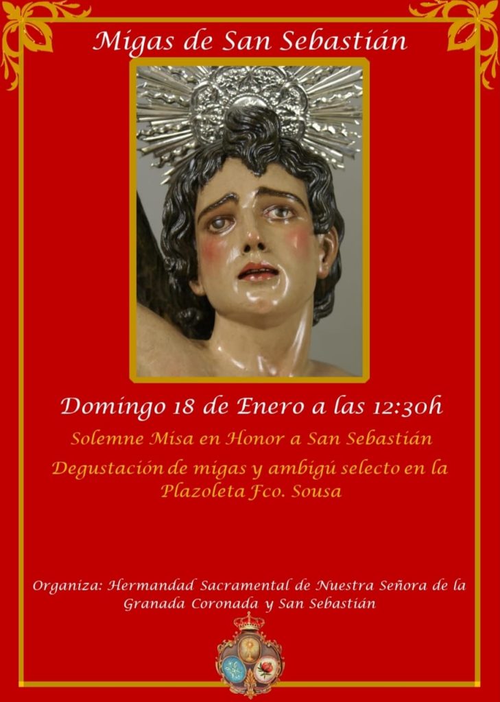 Finalizado estos actos tendrá lugar las tradicionales ‘Migas de San Sebastián’. La cita será el domingo 18 de enero en la plazoleta D. Francisco Sousa Valdivia, junto a la iglesia. La Hermandad también anuncia que para amenizar las migas habrá actuaciones musicales y un bingo.