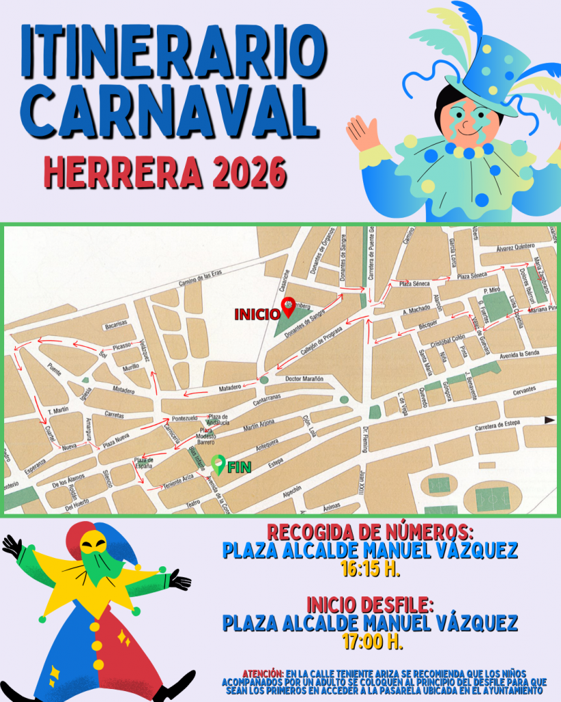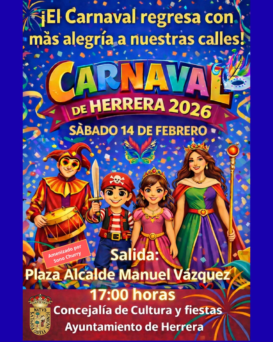 El desfile de Carnaval de Herrera se celebrará el próximo sábado, 14 de febrero, y tendrá como punto de partida la Plaza Alcalde Manuel Vázquez. El inicio está previsto para las 17:00 horas, aunque las personas interesadas en participar en el concurso y optar a los premios deberán recoger su número a partir de las 16:15 horas.