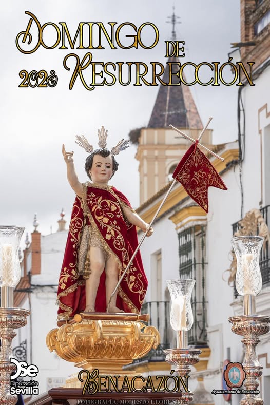 .El cartel, recoge una fotografía de Modesto Llorente en la que aparece un hermoso plano del Niño de Dios con la torre de la Iglesia de fondo en la mañana más alegre de Benacazón.