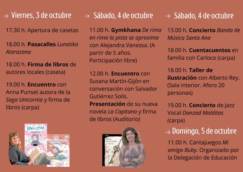 En esta edición, la feria se presenta totalmente renovada, con nuevas casetas y una programación cultural diseñada para acercar la literatura a todos los públicos. Entre las actividades destacamos los encuentros con reconocidas autoras como Susana Martín Gijón (que presentará su nueva novela La Capitana) y Ana Punset (creadora de la Saga infantil Unicornia), así como un taller de creación de cómics, cuentacuentos, gymkhanas poéticas y un concierto de jazz vocal que pondrá la nota musical.