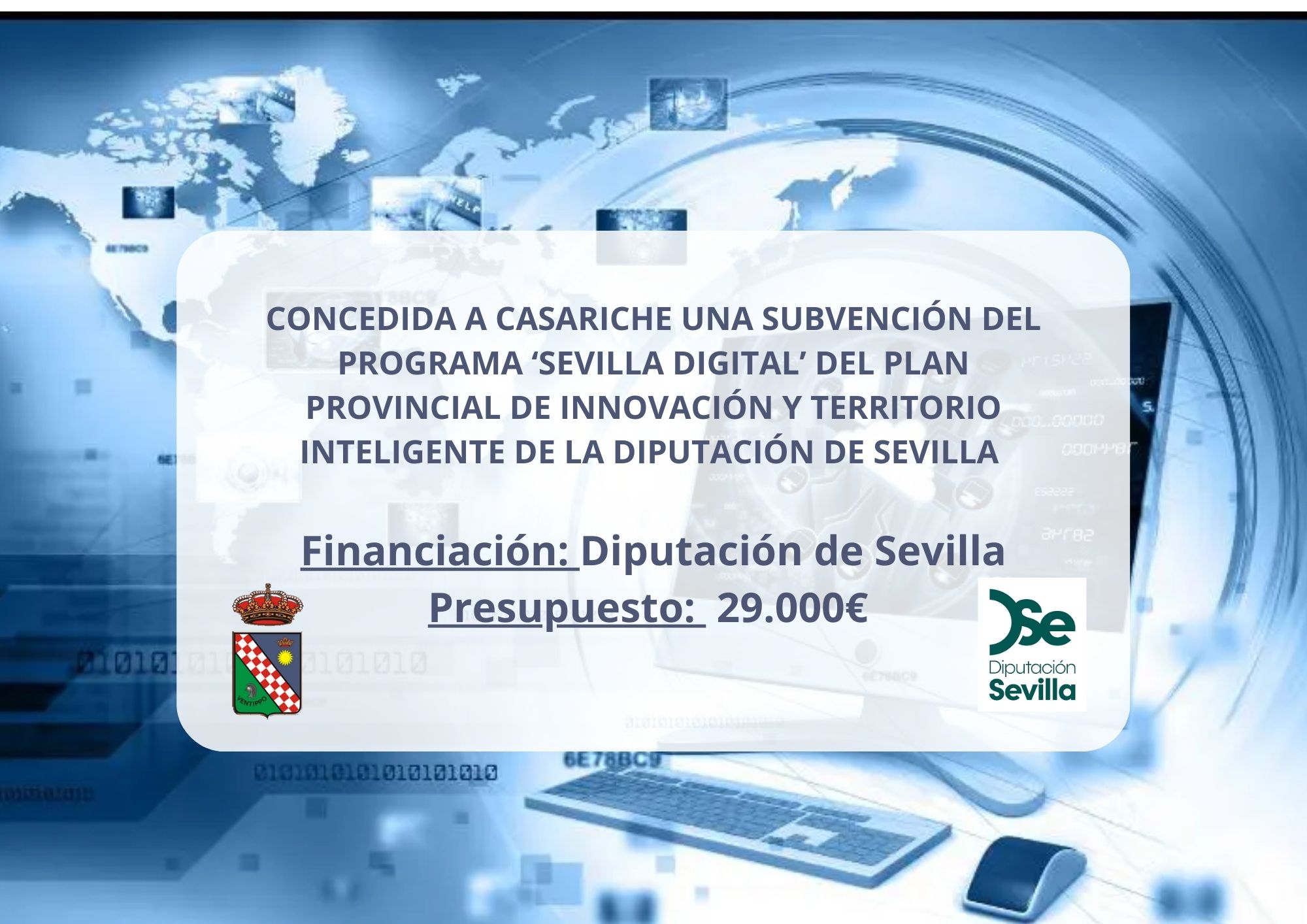 El Ayuntamiento de Casariche informa que ha recibido una subvención de 29.000€ enmarcada en el programa Sevilla Digital, dirigido a Entidades Locales de la provincia de Sevilla. Esta ayuda forma parte del Plan Provincial de Innovación y Territorio Inteligente de la Diputación de Sevilla y tiene como objetivo impulsar la transformación digital del territorio y reducir las brechas tecnológicas existentes entre los municipios.