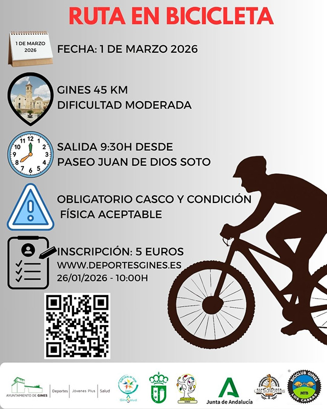 Las delegaciones de Deportes, Jóvenes Plus y Salud del Ayuntamiento de Gines organizan para el próximo 1 de marzo una ruta en bicicleta con la que los participantes aunarán deporte y convivencia.