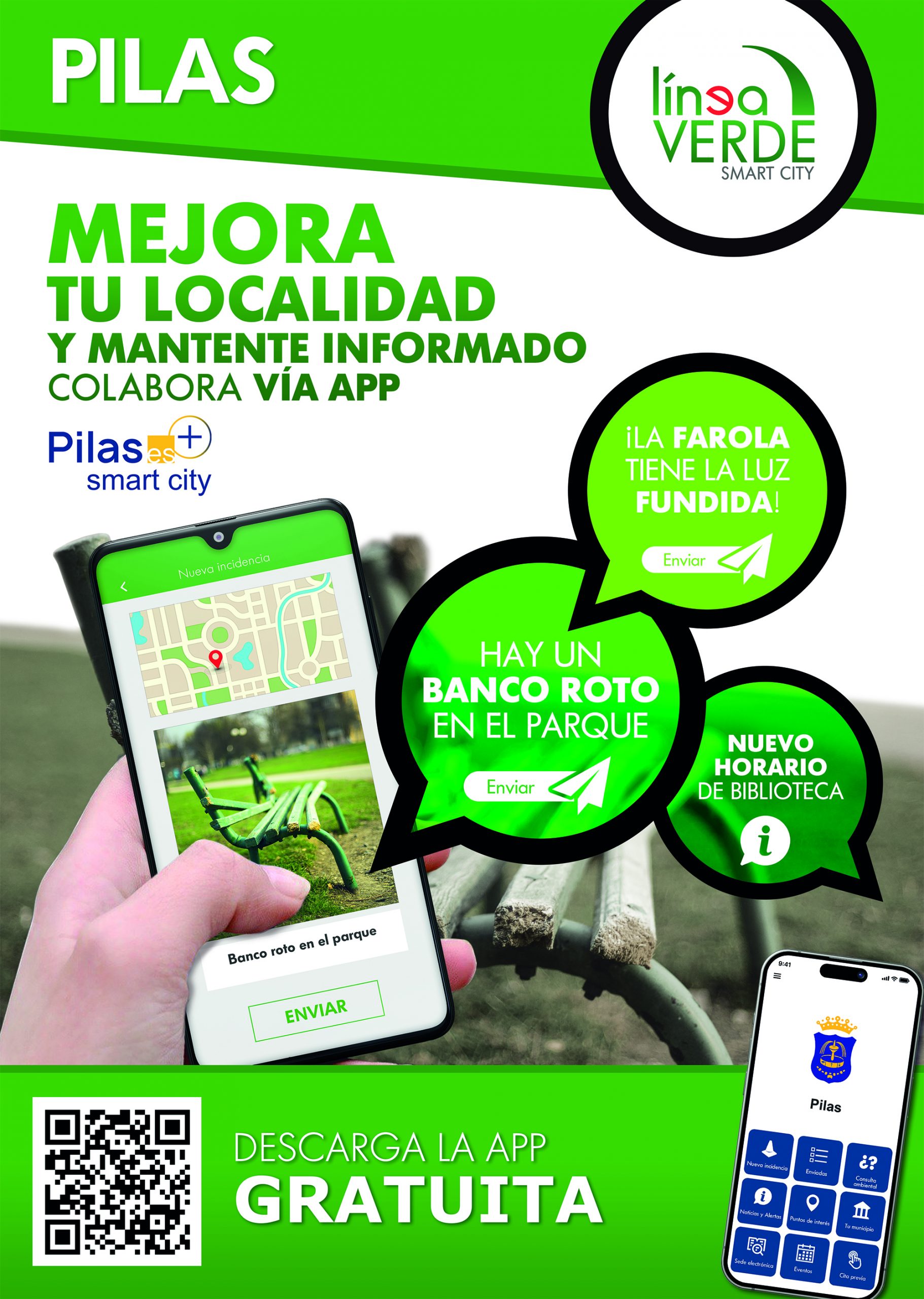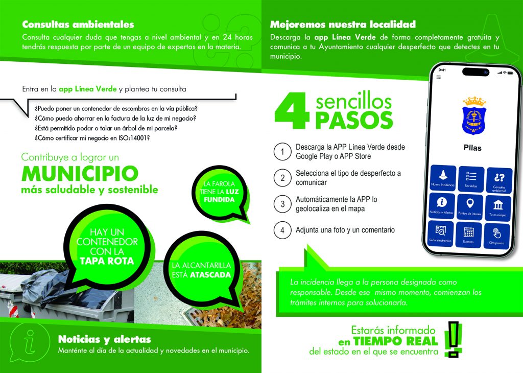 Durante este mes de abril, el Ayuntamiento de Pilas se une a los más de 600 municipios que a nivel nacional disponen del servicio Línea Verde. A través de este canal de comunicación directo, los vecinos pueden poner en conocimiento del Consistorio aquellos desperfectos que detecten en su localidad. Gracias a esta herramienta de participación ciudadana, el Ayuntamiento pretende conocer las necesidades del municipio y así, poder dar solución a las cuestiones comunicadas.