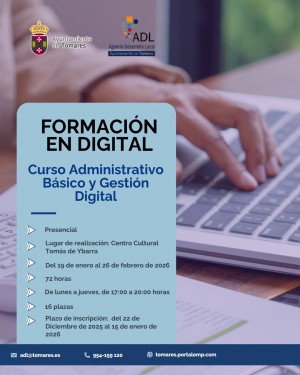 Iníciate o completa tu currículum con el nuevo Curso de “Administrativo Básico y Gestión Digital”, de 72 horas, que ha organizado el Ayuntamiento de Tomares, dentro del Proyecto «Formación en Digital», con el objetivo de ayudar a las personas desempleadas a formarse en una profesión con salidas laborales. También está destinado a aquellas personas que deseen especializarse en esta profesión. Plazo de inscripción abierto hasta el 15 de enero. Se impartirá del 19 de enero al 26 de febrero, de lunes a jueves, de 17:00 a 20:00 horas, en el Centro Cultural Tomás de Ybarra (C/ Concepción Ibarra, nº 1.Plazas limitadas (16 participantes). El requisito: ser mayor de 18 años, con preferencia empadronados en Tomares