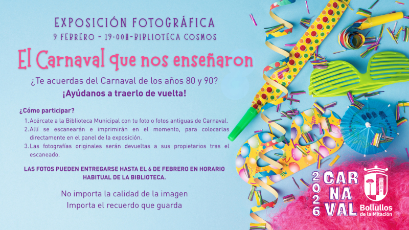 La Biblioteca Municipal Cosmos acogerá el próximo 9 de febrero, a las 19:00 horas, la exposición fotográfica “El Carnaval que nos enseñaron”, una muestra que invita a la ciudadanía a revivir y compartir los recuerdos del Carnaval de los años 80 y 90.