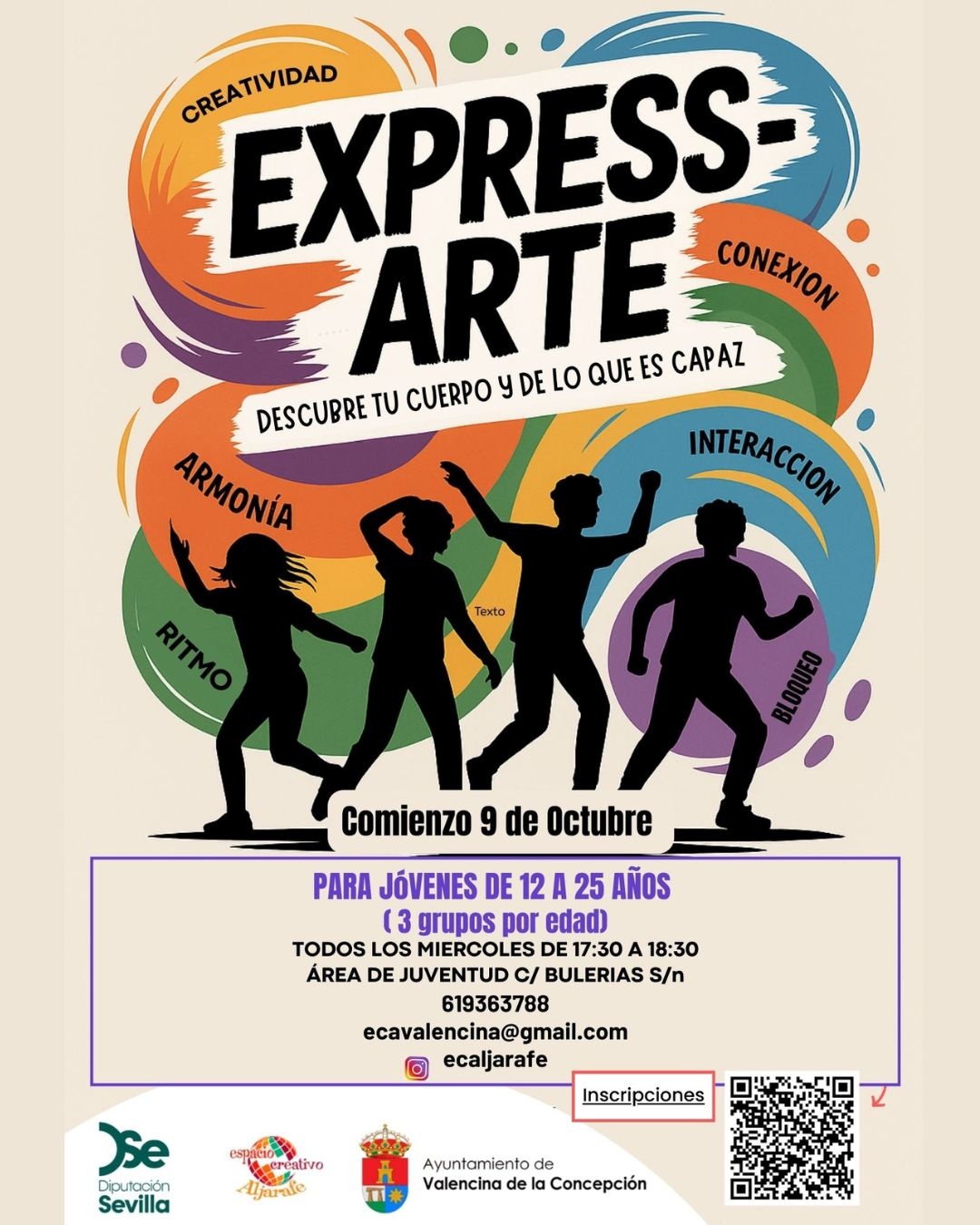 El Ayuntamiento de Valencina de la Concepción, a través de su Área de Juventud, organiza un taller de expresión corporal dirigido a jóvenes de 12 a 25 años, donde se trabajarán las posibilidades del cuerpo, la voz y la creatividad como herramientas de desarrollo personal y colectivo.
