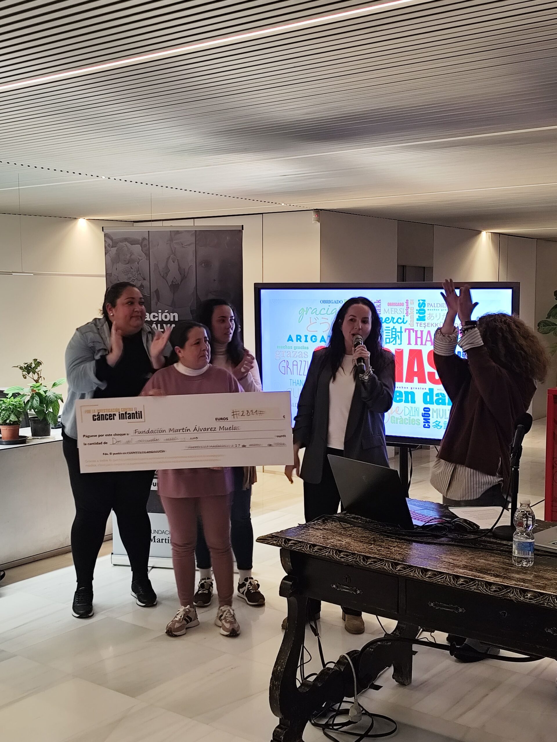 El momento más emotivo de la velada llegó con la entrega de sendos cheques solidarios. Las madres de la localidad hicieron entrega de 2.881 euros recaudados para la Fundación, además de 600 euros aportados por el CEIP Santa Teresa de Jesús, y 1.769 euros CEIP Santo Tomás de Aquino, promotores estos últimos de la iniciativa. Además, Ana Sánchez, presidenta de la Asociación contra el Cáncer de Fuentes de Andalucía, anunció una donación de 5.000 euros por parte de su asociación. En total, el municipio de Fuentes de Andalucía ha contribuido con más de 10.169 euros a la lucha contra el cáncer infantil, una cifra que habla por sí sola del carácter solidario de sus vecinos, incluyendo la colaboración de los centros educativos de la localidad.