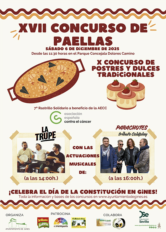 Las bases completas de ambos concursos pueden consultarse en los siguientes enlaces: concurso de paellas (https://ayuntamientodegines.es/wp-content/uploads/2025/11/Bases-X-Concurso-de-Paellas-Gines-2025.pdf) y concurso de postres y dulces (https://ayuntamientodegines.es/wp-content/uploads/2025/11/Bases-X-Concurso-de-Postres-y-Dulces-Tradicionales-Gines-2025.pdf)