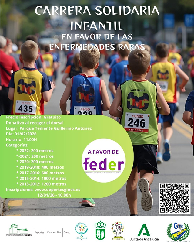 Gines celebrará prepara ya la Carrera Solidaria Infantil a favor de la lucha contra las Enfermedades Raras, una prueba que tendrá lugar finalmente el domingo 1 de febrero y que tiene como objetivo recaudar fondos para la Federación Española de Enfermedades Raras (FEDER).
