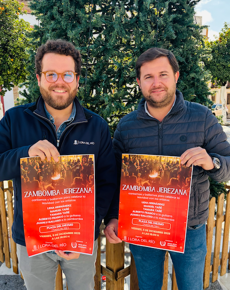 El concejal-delegado de Cultura y Fiestas Mayores, Rafael Navarro Iribarnegaray, y el hermano mayor de la Hermandad de la Borriquita, Fran Lira, presentan el cartel anunciador de la Zambomba Jerezana.