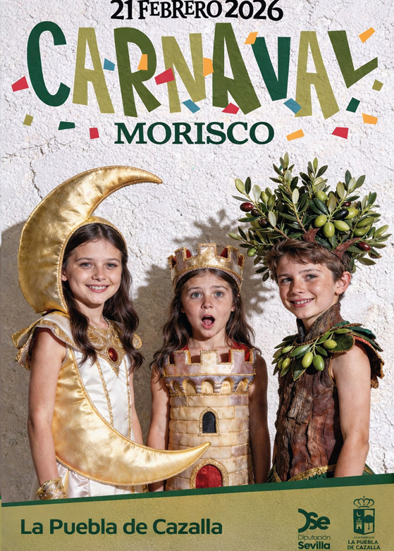 El cartel del Carnaval este año hace alusión a nuestra señas de identidad. La Concejala de festejos, Mónica Espinar destaca que «para este 2026 se ha realizado un cartel digital donde los protagonistas son los niños, en este caso, disfrazados de luna, castillo y olivos».