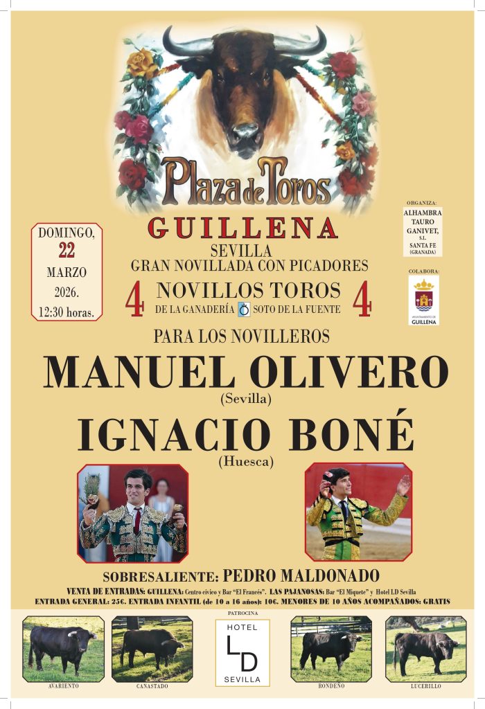 Hoy, domingo 22 de marzo, a las 12:30 del mediodía, en la plaza de toros de Guillena, se va a celebrar una novillada con picadores. Se lidiarán cuatro novillos de la ganadería de Soto de la Fuente para los novilleros Manuel Olivero (Sevilla) e Ignacio Boné (Huesca). Como sobresaliente actuará Pedro Maldonado.