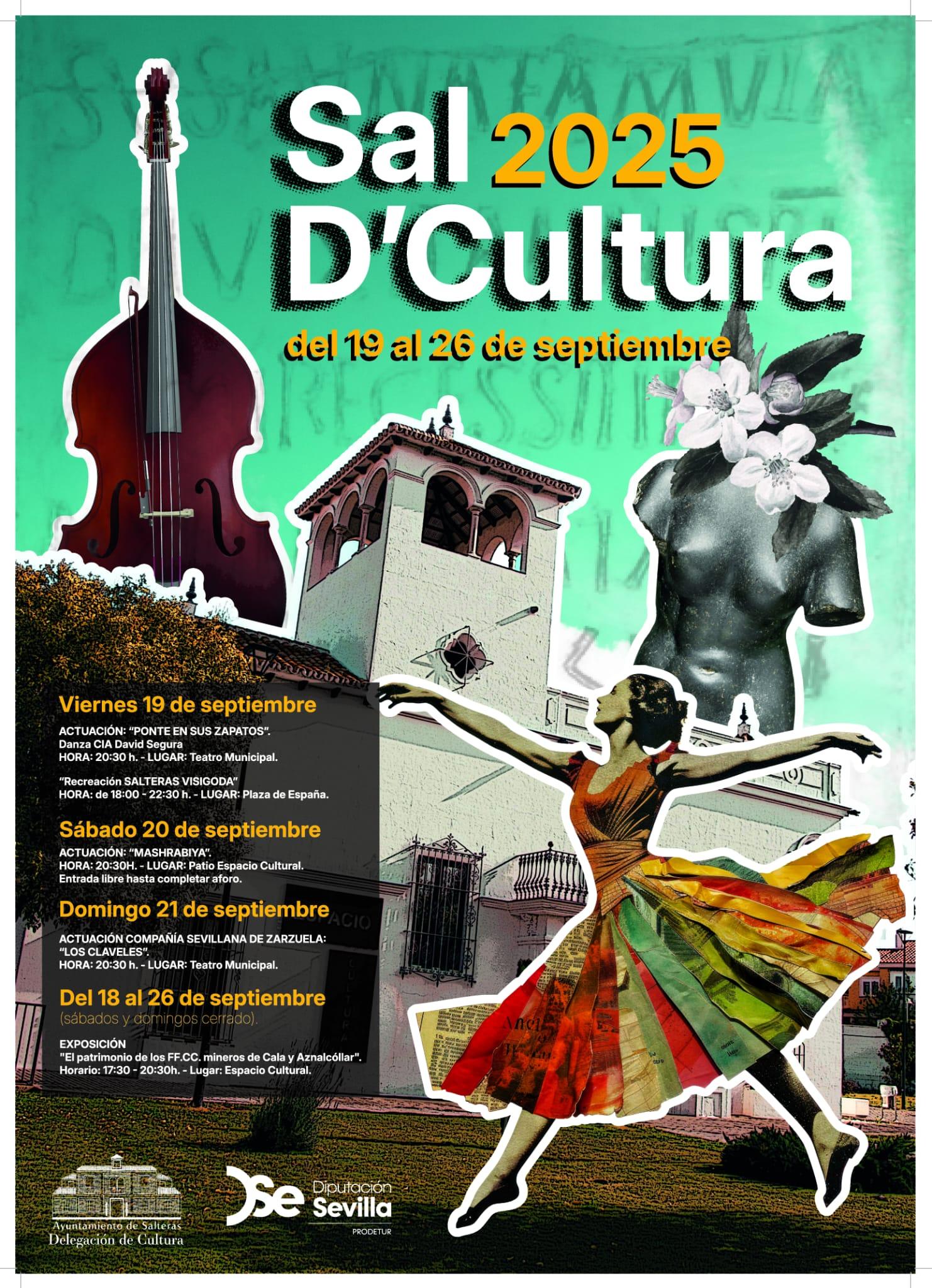 Un año más, el Ayuntamiento de Salteras, en colaboración con la Diputación de Sevilla, promueve el ciclo Sal D’Cultura 2025, que contempla diversas citas culturales entre el viernes 19 de septiembre y el domingo 21, así como una interesante exposición sobre el patrimonio de los ferrocarriles, que podrá visitarse del 18 al 26 de septiembre.