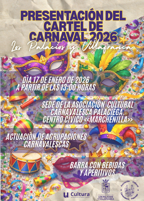La sede de Asociación Cultural Carnavalesca Palaciega, ubicada en el Centro Cívico “Marchenilla”, acogerá este sábado 17 de enero, a partir de las 13:00 horas, la presentación oficial del cartel del Carnaval 2026.