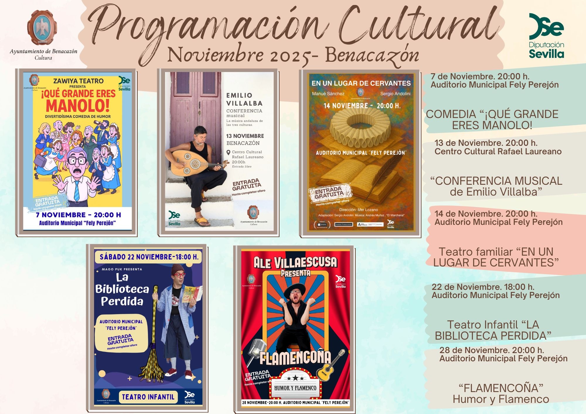 Esta es la nueva Programación Cultural para el mes de Noviembre, con actividades para todos los públicos, familiar, teatro de adultos y teatro infantil, organizada por la Concejalía de Cultura de Benacazón, a través del Programa 107 de la Diputación de Sevilla.