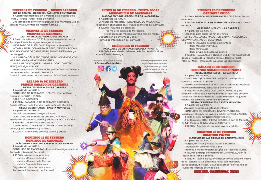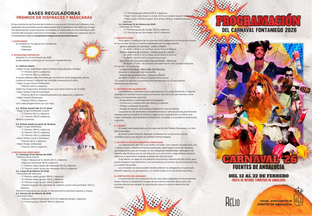 Carnaval regresa un año más por febrero a Fuentes de Andalucía, del 12 al 22 de febrero. Diez días en los que la copla, el ingenio y el arte popular llenarán cada rincón de nuestra localidad.