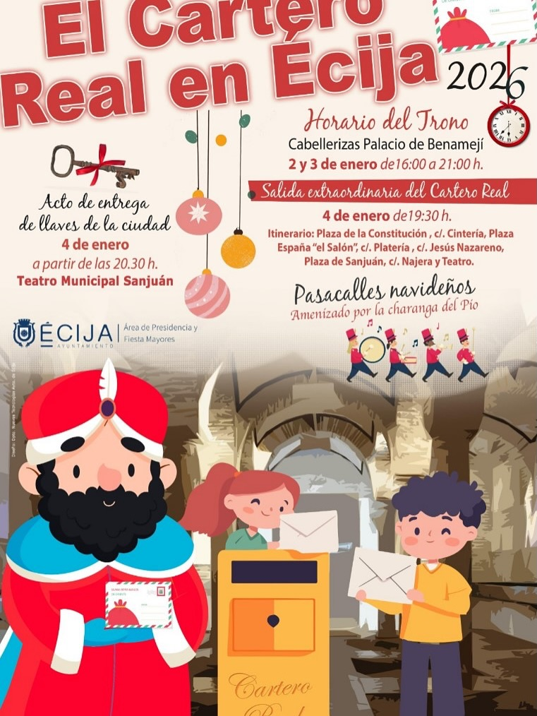 -El Cartero Real en Écija. 2 y 3 de enero de 16.00 a 21.00 h. Caballerizas del Palacio de Benamejí. 4 de enero: Salida extraordinaria.