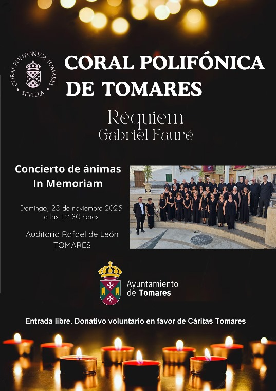 La prestigiosa Coral Polifónica Tomares, dirigida por Manuel Alejandro González, deleitará al público este domingo, 23 de noviembre, a las 12:30 horas, en el Auditorio Municipal Rafael de León, con el Réquiem del destacado compositor francés Gabriel Furé (1845-1924), considerada una de las más hermosas misas de réquiem de la historia de la música, interpretada por primera vez en 1888 en la Iglesia de la Madeleine de París. Concierto de Ánimas In Memoriam, que será benéfico, ya que los donativos (voluntarios) irán destinados a Cáritas Parroquial de Tomares. Entrada libre hasta completar aforo