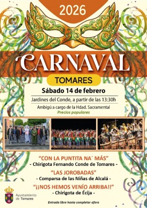 Tomares vivirá una gran Fiesta de Carnaval este sábado, 14 de febrero: La famosa Comparsa de las Niñas de Alcalá “Las Jorobadas”, que ha llegado hasta Cuartos de Final en el Falla; la Chirigota de Écija, “¡¡Nos hemos venío arriba!!”, que el año pasado causó sensación en el COAC con “Al cielo con él” y que también se ha situado este año en Cuartos, y la Chirigota tomareña de Fernando Conde “Con la puntita na´ más” serán las protagonistas del Carnaval de Tomares 2026, organizado por el Ayuntamiento, en Los Jardines del Conde de la Hacienda Santa Ana, sede del Ayuntamiento. La Gala, que comenzará a las 13:00 horas con un Pasacalles de la Chirigota de Fernando Conde desde Las Cuatro Esquinas, contará con servicio de ambigú a precios populares a cargo de la Hdad. Sacramental y talleres infantiles desde las 14 hasta las 17 horas. Amenizarán el resto de la tarde, la música del DJ “Los Buleros” y del grupo local “AutoReverse”. Entrada libre hasta completar aforo
