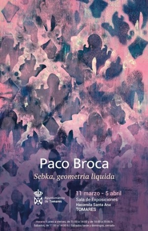La Sala de Exposiciones de la Hacienda Santa Ana, sede del Ayuntamiento de Tomares, inaugura este miércoles, 11 de marzo, a las 20:00 horas, la Exposición “Sebka, geometría líquida”, una muestra del reconocido pintor paisajista Paco Broca, uno de los artistas más sobresalientes en el panorama artístico sevillano. Una interesante propuesta pictórica inspirada en la “sebka”, la trama geométrica de tradición islámica que evoca el movimiento del agua: la geometría romboidal que se forma cuando el agua cae por un plano vertical. Se podrá visitar hasta el 5 de abril. Entrada libre