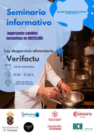 Dirigida a empresarios, hosteleros y comerciantes, se informará sobre los nuevos cambios normativos que afectan al sector de la hostelería y de la restauración en España: “El Verifactu”, la nueva forma de facturación exigida por Hacienda, y la Ley de Desperdicio Alimentario. Será de 10:00 a 12:00 horas, en el Salón de Plenos del Ayuntamiento de Tomares (C/ de la Fuente, 10). Organizada por el Ayuntamiento de Tomares, en colaboración con la Asociación de Hosteleros de Sevilla y Provincia y la Cámara de Comercio de Sevilla