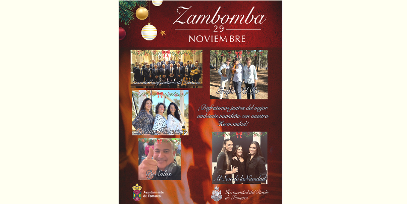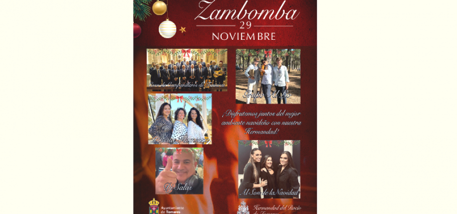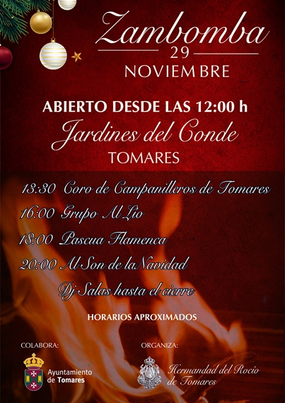 La Navidad comienza en Tomares este sábado, 29 de noviembre, con la gran Zambomba Navideña que ha organizado la Hermandad del Rocío, en colaboración con el Ayuntamiento, desde las 12:00 horas hasta por la noche, en Los Jardines del Conde: El Coro de Campanilleros de Tomares, los grupos de flamenquito Al Lío, Pascua Flamenca y Al Son de la Navidad, y el DJ Salas llenarán de la mejor música y villancicos flamencos el recinto. Ambigú desde las 12:00 horas con precios populares. Es una de las actividades de la gran Programación de Navidad con más de 100 eventos que ha organizado el Ayuntamiento de Tomares para que los vecinos disfruten