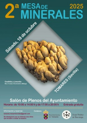 La 2ª Mesa de Minerales de Tomares, que se celebrará en el Salón de Plenos, Patio de la Fuente y Patio de las Buganvillas de la Hacienda Santa Ana (sede del Ayuntamiento), de 10 a 14 horas y de 17 a 20 horas (entrada gratuita), será un evento muy especial que atraerá a miles de aficionados, coleccionistas, curiosos y público de toda Andalucía interesados en el fascinante mundo de la mineralogía y en los minerales de colección.