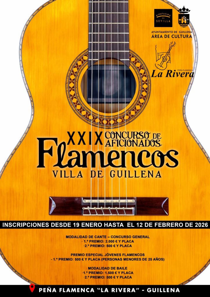 El Área de Cultura del Ayuntamiento de Guillena y la Peña Flamenca la Rivera de Guillena informan que hasta el 12 de febrero está abierto el periodo de inscripción para participar en el XIX Concurso de Aficionados flamencos Villa de Guillena.